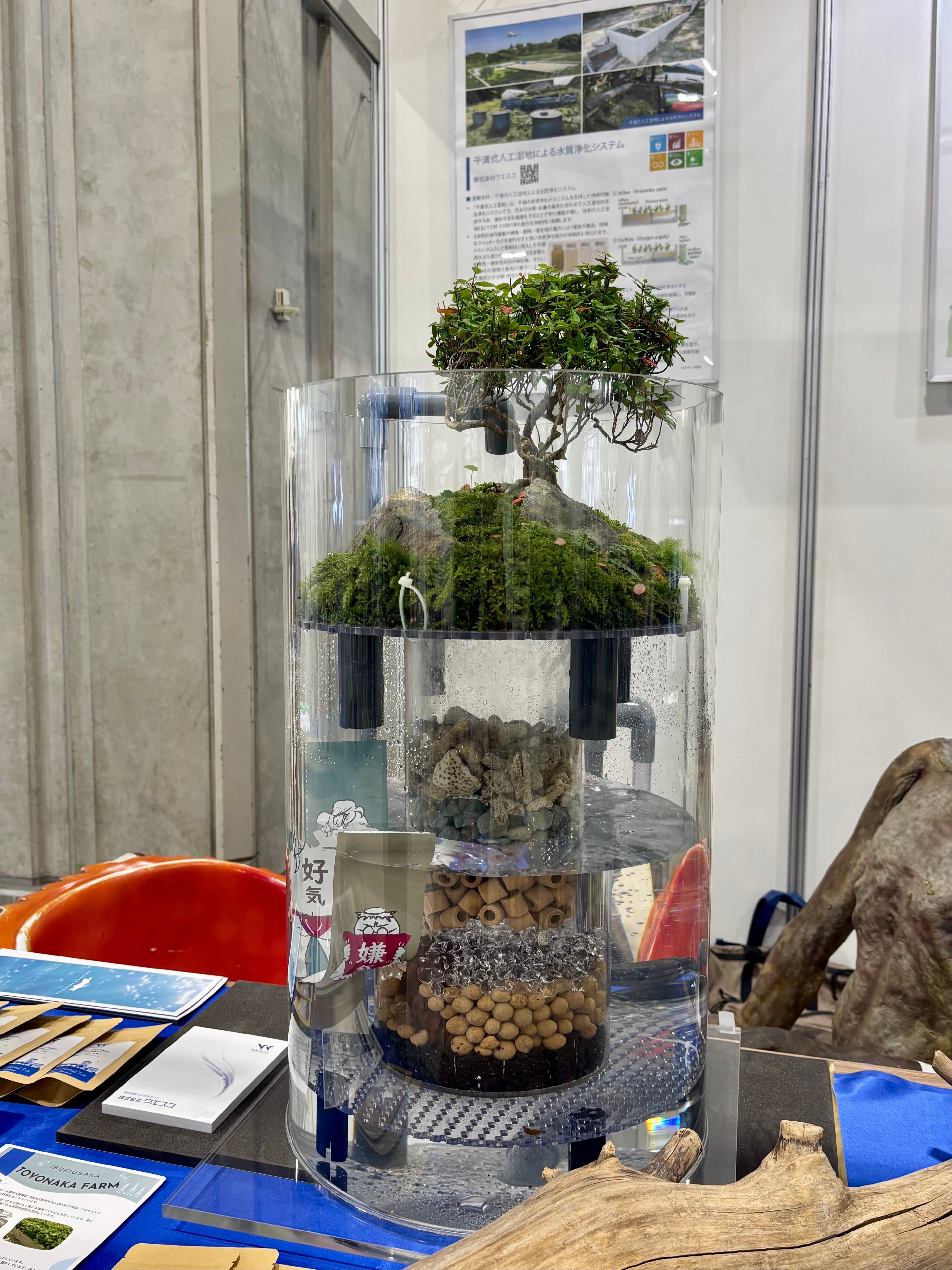 ブースでは、干満式人工湿地の仕組みをご覧いただくため、模型を制作・展示いたしました。その模型の上部にある「苔テラリウム」を moss connect様に制作いただきました。